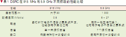 DSRC是一种无线通信技术,负责在车路以及车车之间建立信息的双向传输,支持公共安全和私有操作。DSRC能够提供高速的数据传输,并且能保证通信链路的低延时和系统的可靠性,是专门用于车辆通信的技术。DSRC迄今为止还没有形成统一国际标准,国际上DSRC标准主要有欧、美、日三大阵营:欧洲ENV系列、美国900 MHz和日本ARIBSTD-T75标准。1992年,ASTM主要针对ETC业务的开发而最先提出DSRC技术的概念,其采用915 MHz频段。2002和2003年ASTM分别通过了DSRC标准E2213-02及其改进版本E2213-03,工作频率为5.9 GHz。表1给出了分别工作在915 MHz与5.9 GHz不同频段的DSRC的性能比较。DSRC工作在5.9 GHz时,通信范围扩展到1 000 m,数据传输速率也提高到6~27 Mbit/s。表2介绍了DSRC与其他无线通信技术的区别[5]。DSRC能在短距离通信范围内进行高速数据传输,而且成本很低廉。