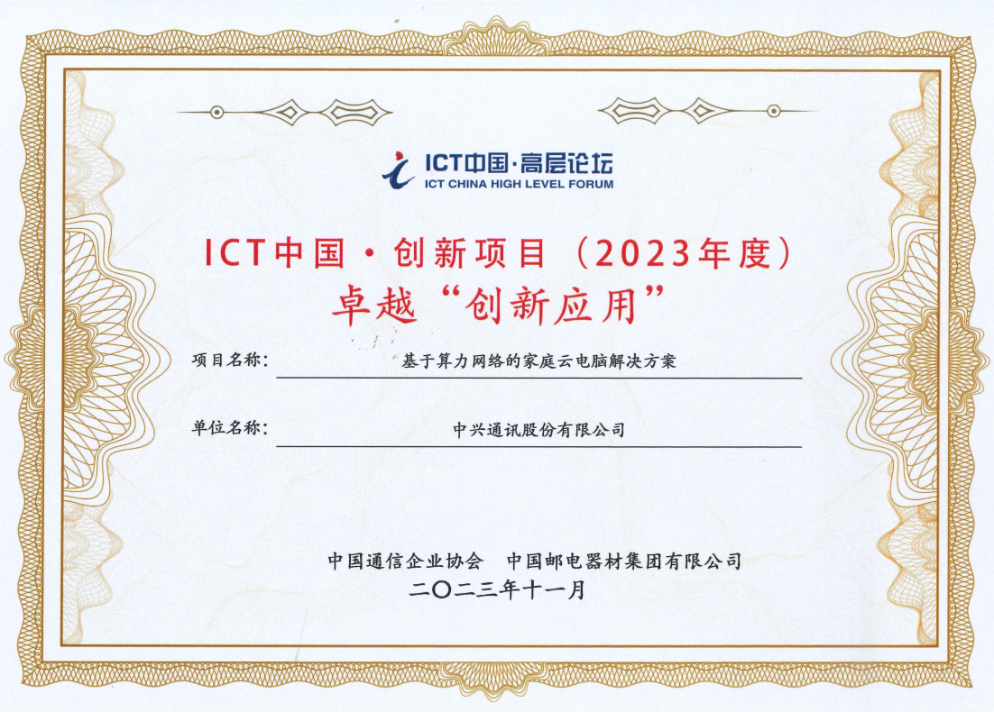 中兴通讯“基于算力网络的家庭云电脑解决方案” 斩获ICT中国(2023)案例评选卓越一等奖