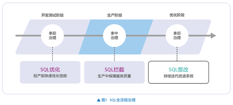SQL治理涉及应用的开发阶段、生产阶段和事后优化等全流程环节,以保障生产系统稳健运行,并持续提升质量(见图1)。在开发阶段进行SQL审核,提升SQL编写质量;生产过程中快速终止严重影响服务的SQL任务,并在事后对不良SQL进行迭代优化。