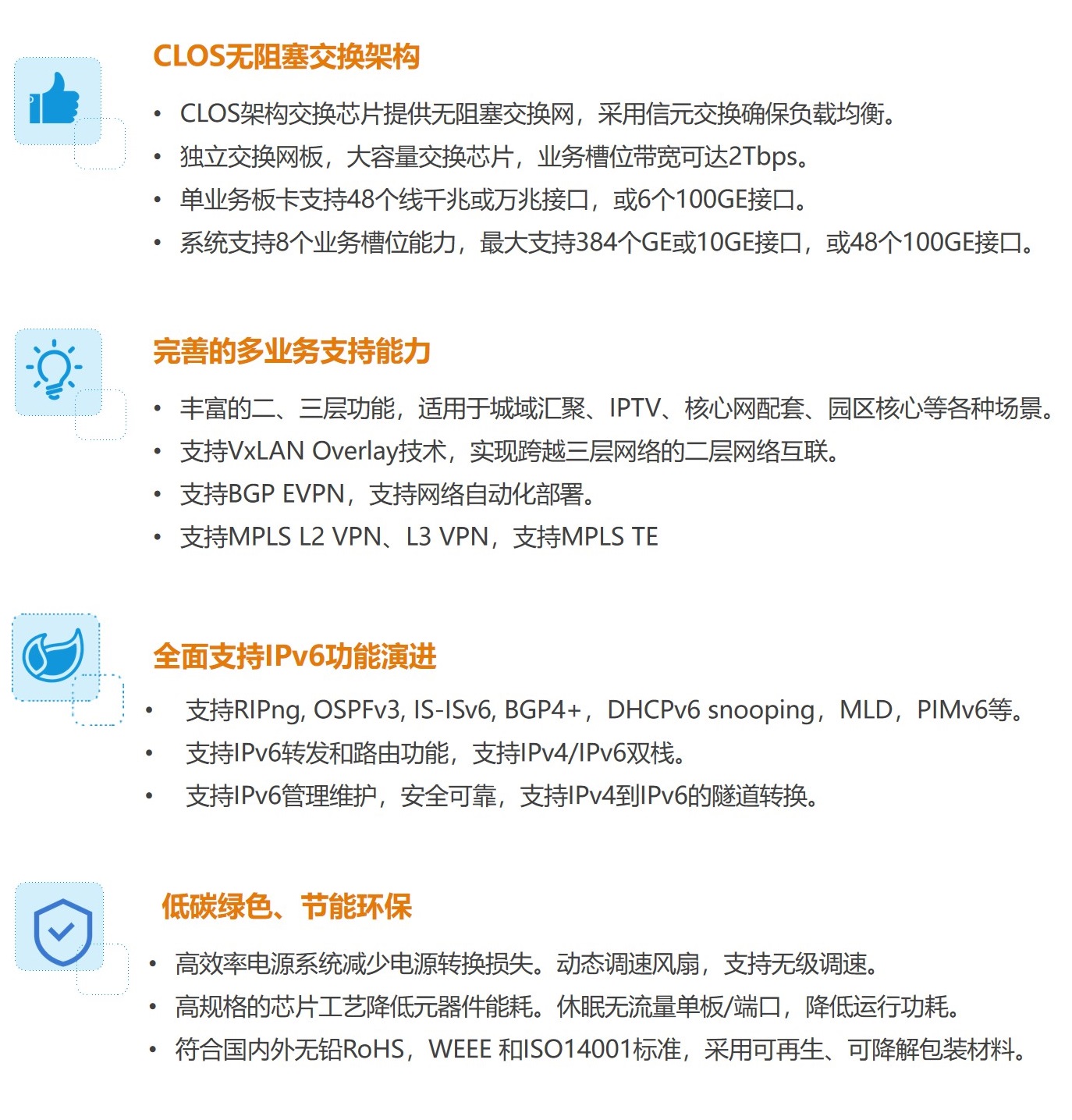 | 业务板卡类型 | 48端口千兆电接口板; 24端口千兆电接口板; 48端口千兆光接口板; 24端口千兆光接口板; 48端口万兆光接口板; 24端口万兆光接口板; 48端口千兆PoE电接口板; 24端口千兆电+16端口千兆光+8端口万兆光混合速率接口板; 6端口100G光接口板 | |