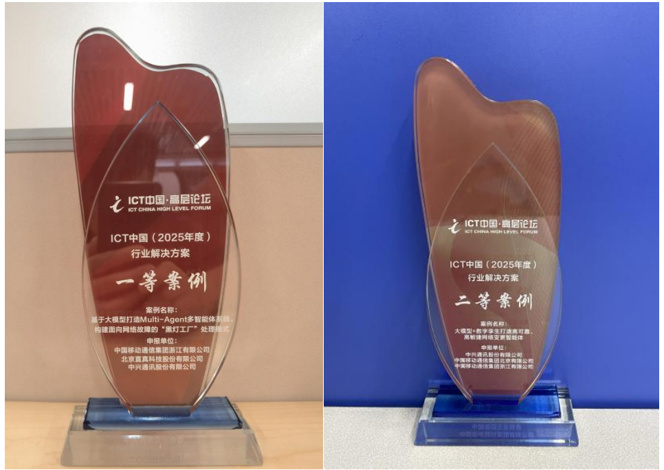 近日,“ICT中国(2025)案例征集与发布”奖项结果揭晓,在众多引领ICT技术创新的案例中,浙江移动联合中兴通讯打造的创新项目“基于大模型打造Multi-Agent多智能体系统,构建面向网络故障的‘黑灯工厂’处理模式”斩获最高荣誉“卓越一等奖”,创新项目“大模型+数字孪生打造高可靠、高敏捷网络变更智能体”荣膺“卓越二等奖”,全面展示了浙江移动在传输网络智能化运维方面取得的探索创新和实践成果。