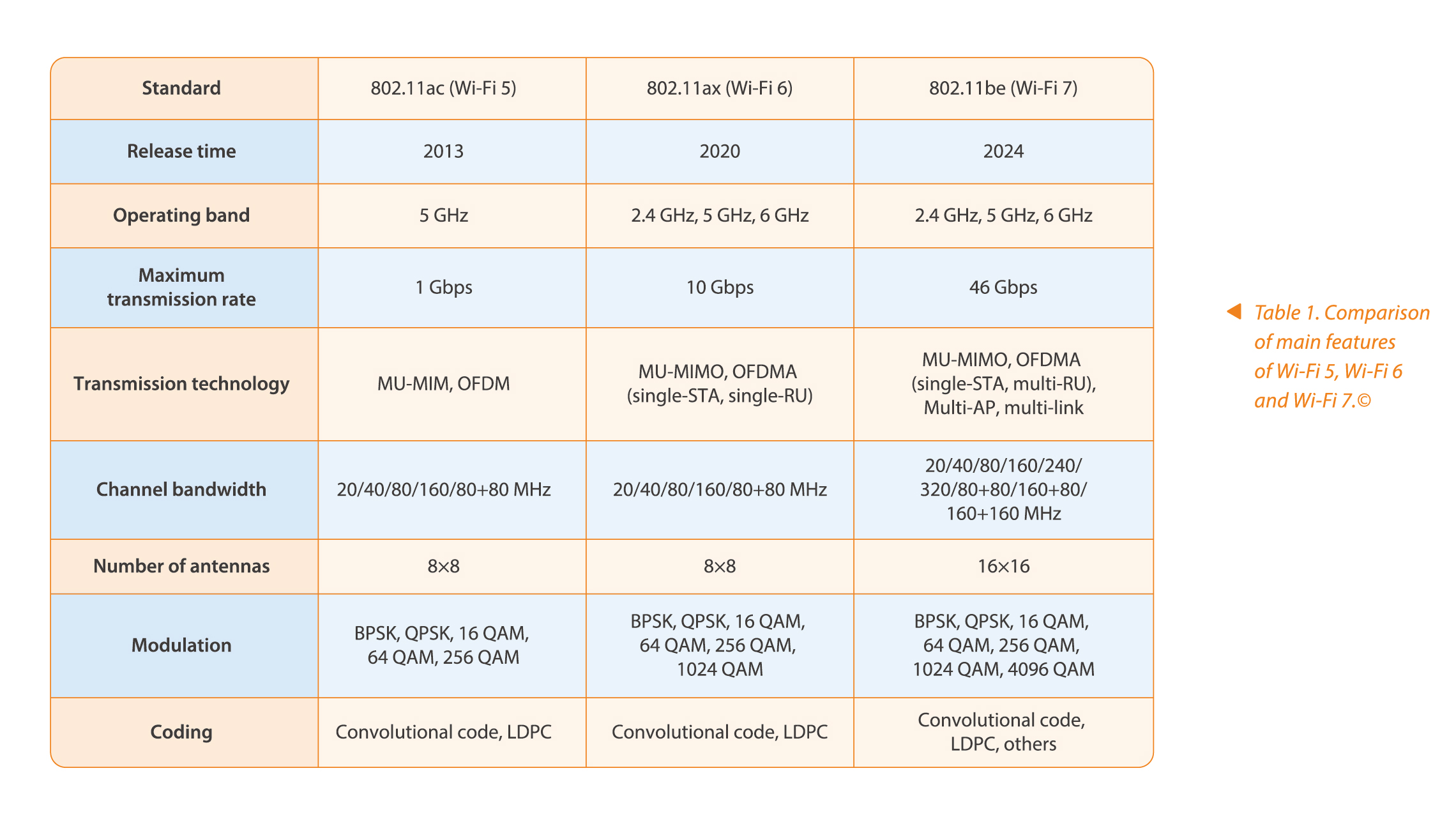 The main features of Wi-Fi 5, Wi-Fi 6 and Wi-Fi 7 are compared in Table 1.