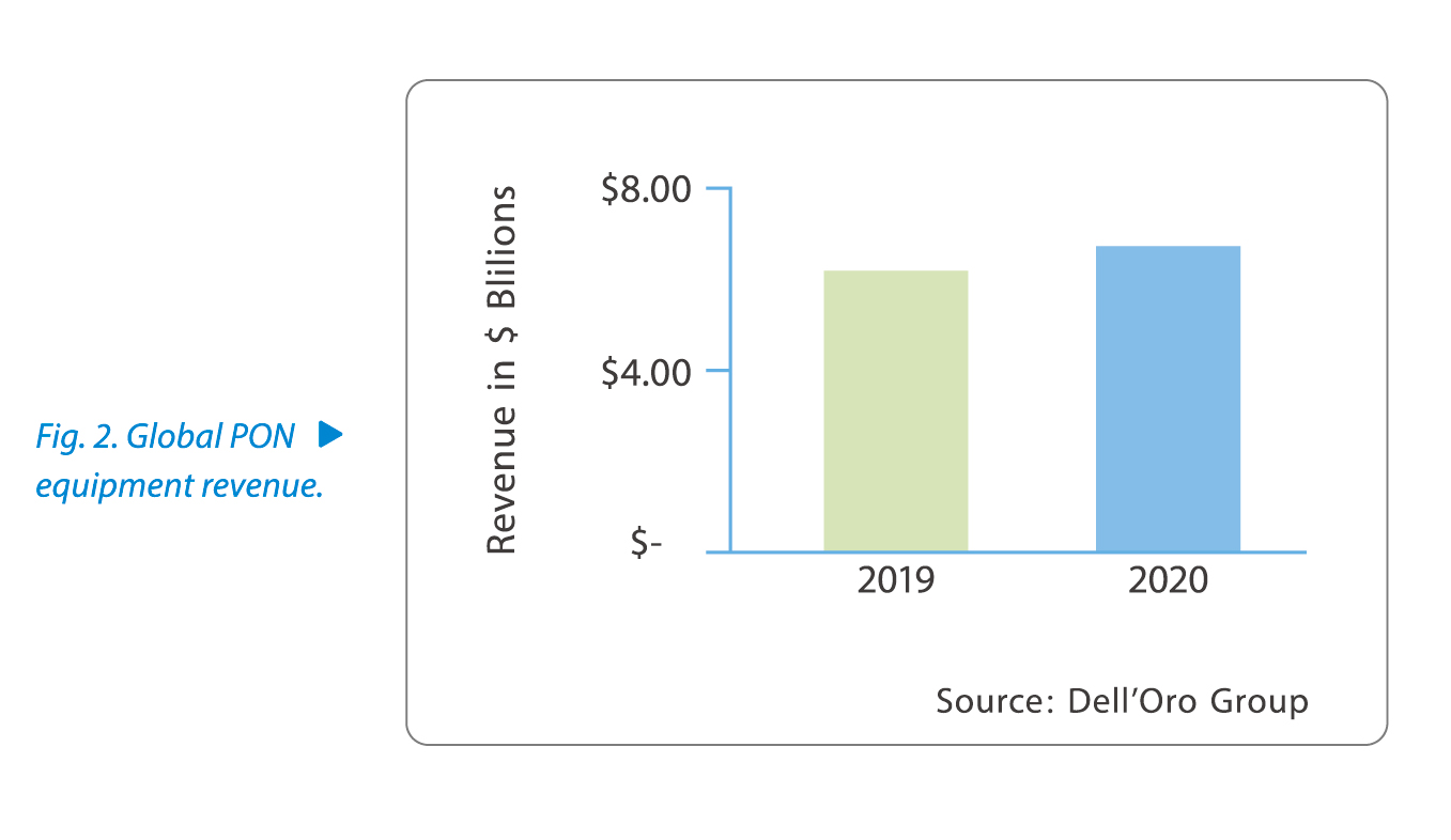 The fiber expansion in 2020, which saw total spending on PON equipment jump 8% (Fig. 2), involved multiple technologies—from 1G EPON and 2.5G GPON to XG-PON and XGS-PON. While the clear trend among operators is to expand their fiber services using 10G technologies, there are still hundreds of operators who will continue to rely on 2.5G GPON as the workhorse for their fiber networks for years to come.