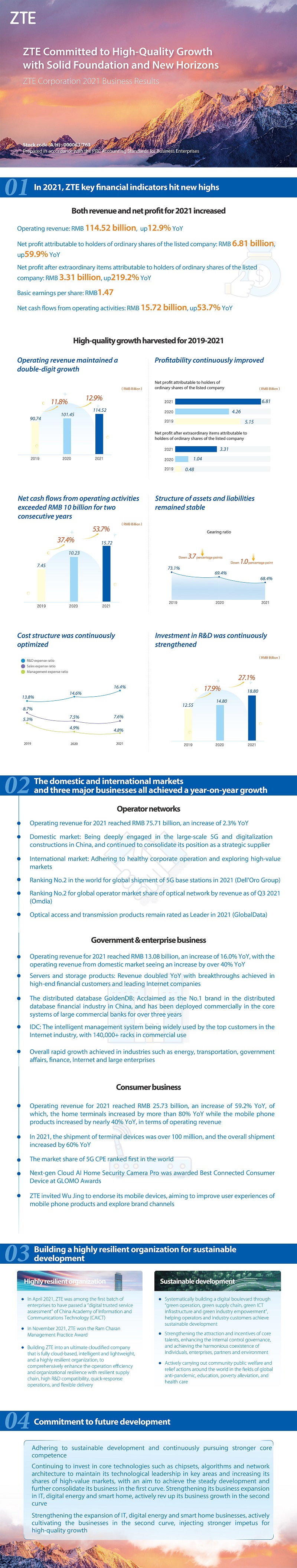 The year 2021 was crucial for ZTE's growth phase. During the year, the company, although confronted with the global COVID-19 pandemic and complex external environment, kept solidifying its position with innovative initiatives while maintaining steady operations. While consolidating the company's core competitiveness, ZTE furthered its digital transformation and continued to expand its capability and transaction boundaries. During the period, the company witnessed significant improvement in its corporate operational quality, with key financial indicators such as operating revenue, net profit and net cash flow from operating activities hitting the highest in the company's history.